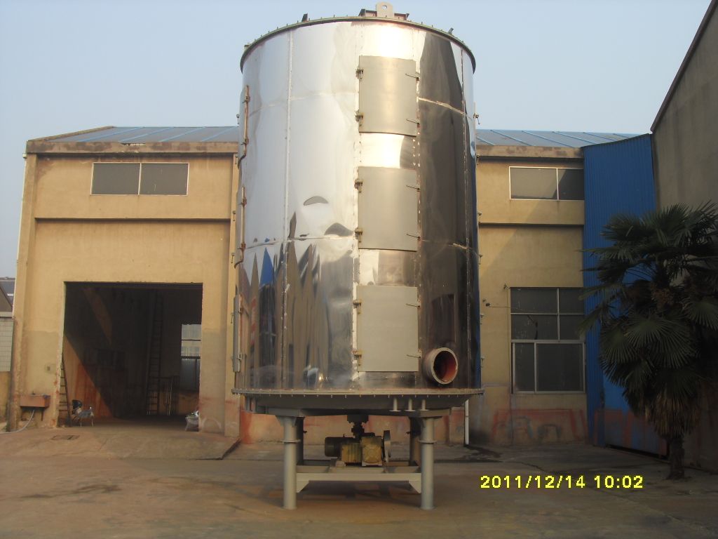 湿物料自加料器连续地加到干燥器上部干燥盘上,带有耙叶的耙臂作回转运动使耙叶连续地翻 抄物料。物料沿指数螺旋线渡过干燥盘表面,在小干燥盘上的物料被移送到外缘,并在外缘落到下方的大干燥盘外缘,在大干燥塔上物料向里移动并从中间落料口落入下一层小干燥盘中。大小干燥盘上下交替排列,物料得以连续地流过整个干燥器。中空的干燥盘内通入加热介质,加热介质形式有饱和蒸汽、热水和导热油,加热介质由干燥盘的一端进入,从另一端导出。已干物料从一层干燥盘落到壳体的底层,被耙叶移送到出料口排出。湿份从物料中逸出。由设在顶盖上的排湿口排出,真空型盘式干燥器的湿气由设在顶盖上的真空泵抽出。从底层排出的干物料可直接包装。通过配加翅片加热器、溶剂回收冷凝器、袋式除尘器、干料返混木结构、引风机等辅机,可提高其干燥的生产能力,干燥膏糊状和热敏性物料,可方便地回收溶剂,并能进行热解和反应操作。