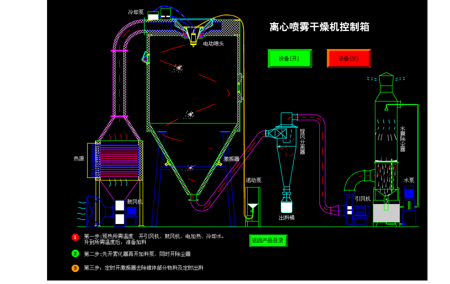 空气经过滤和加热,进入干燥器顶部空气分配器,热空气呈螺旋状均匀地进入干燥室。料液经塔体顶部的高速离心雾化器,(旋转)喷雾成极细微的雾状液珠,与热空气并流接触在极短的时间内可干燥为成品。成品连续地由干燥塔底部和旋风分离器中输出,废气由风机排空。