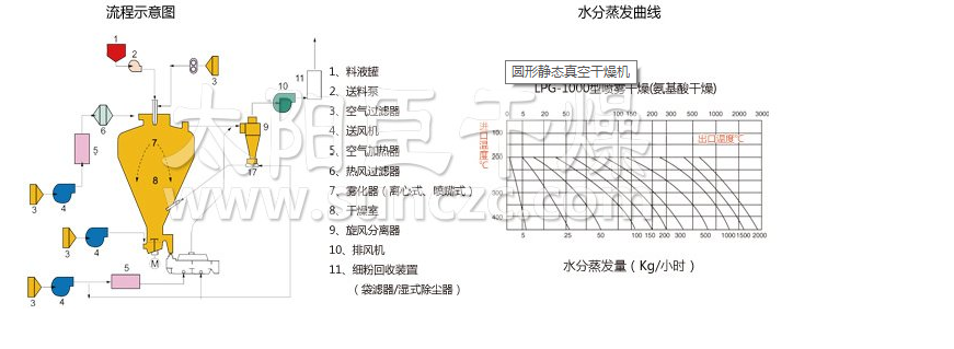 空气经过滤和加热,进入干燥器顶部空气分配器,热空气呈螺旋状均匀地进入干燥室。料液经塔体顶部的高速离心雾化器,(旋转)喷雾成极细微的雾状液珠,与热空气并流接触在极短的时间内可干燥为成品。成品连续地由干燥塔底部和旋风分离器中输出,废气由风机排空。