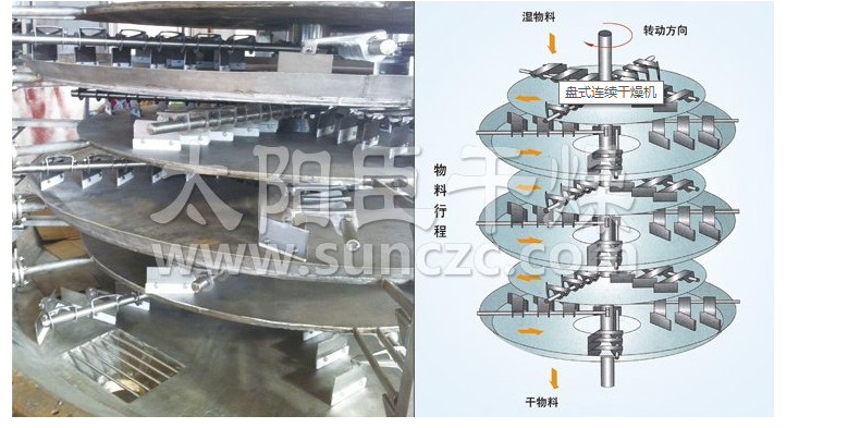 湿物料自加料器连续地加到干燥器上部盘上,带有耙叶的耙臂作回转运动使耙臂作回转运动使耙叶连续地翻抄物料。物料沿指数螺旋线流过干燥盘表面,在小干燥盘上的物料被移送到外缘,并在外缘落到下方的大干燥盘外缘,在大干盘上物料向里移动并从中间落料口落如下一层小干燥盘中。大小干燥盘上下交替排列,物料得以连续地流过整个干燥器。中空的干燥盘内通入加热介质,加热介质形式有饱和蒸汽、热水和导热油,加热介质由干燥盘的一端进入,从另一端导出。已干物料从底层干燥盘落到壳体的底层,而后被耙叶移送到出料口排出。湿份从物料中逸出,由设在顶盖上的排湿口排出,真空型盘式干燥器的湿气由设在顶盖上的真空泵口排出。从底层排出的干物料可直接包装。通过配加翅片加热器、溶剂回收冷凝器、袋式除尘器、干料返混机构、引风机等辅机,可提高其干燥的生产能力,干燥膏糊状和热敏性物 料,可方便地回收溶剂,并能进行热解和反应操作。
