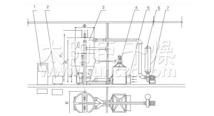 本机组工作过程为料液通过隔膜泵高压输入,喷出雾状液滴,然后同热空气并流下降,大部分粉粒由塔底排料口收集,废气及其微小粉末经旋风分离器分离,废气由抽风机排出,粉末由设在旋风分离器下端的授粉筒收集,风机出口还可装备二级除尘装置,回收率在96-98%以上。